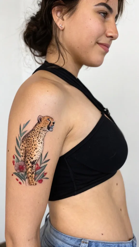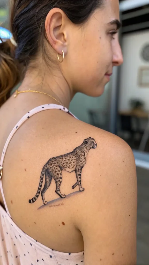 When placed on the shoulder, the cheetah’s dynamic movement and energy are accentuated, creating a visually appealing design.