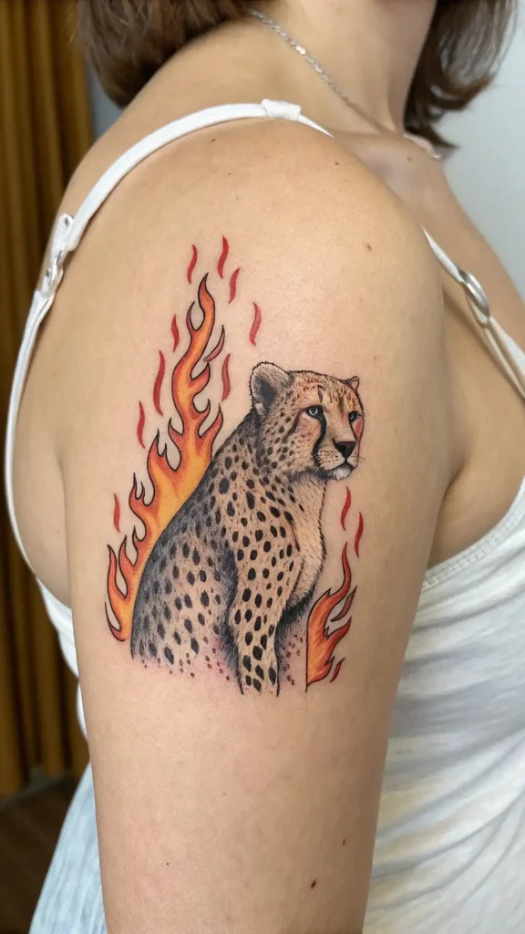 - Intertwined flames: Wrap flame patterns around the cheetah’s body, emphasizing the connection between your inner fire and your athletic abilities.