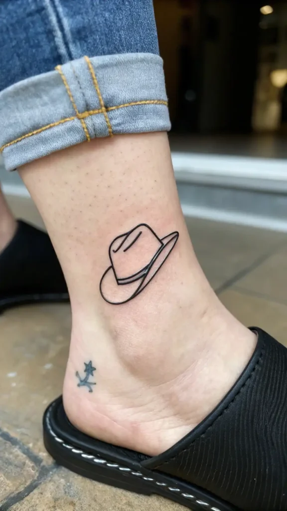 You’re considering a small cowboy hat tattoo on your ankle, a delicate canvas. Opt for minimalist designs to avoid overwhelming the ankle placement, and choose bold lines, subtle shading to create a striking, whimsical piece.