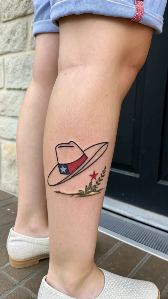 Alternatively, a Distressed Leather Hat Tattoo or a Minimalist Cowboy Hat Emblem exudes rugged charm and subtle sophistication. For a bold statement, opt for a Rodeo Hat Sleeve Design, a Stacked Hat Country Design, or a Bandana Wrapped Hat Tattoo.