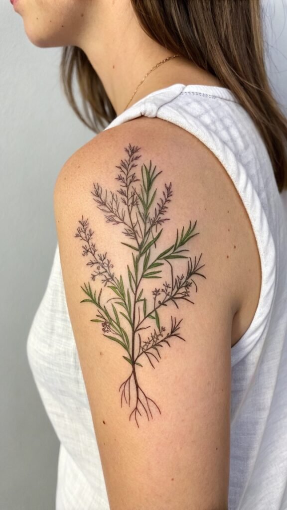 You’re now exploring a tattoo design that embodies the essence of remembrance, loyalty, and growth, drawing from a timeless herb that has captivated botanical artists and enthusiasts alike.