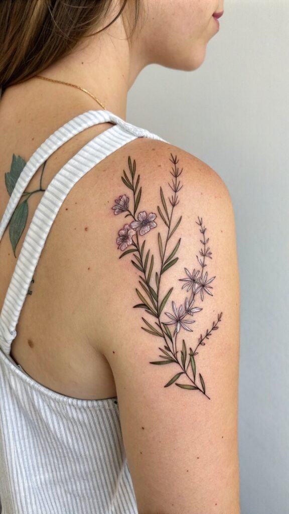 When creating your intricate rosemary garland tattoo, consider incorporating other elements that complement the herb’s fragrance and symbolism.