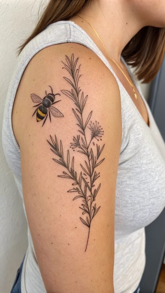 When designing a rosemary and bee tattoo, you can experiment with various styles, from delicate line work to bold, colorful depictions.